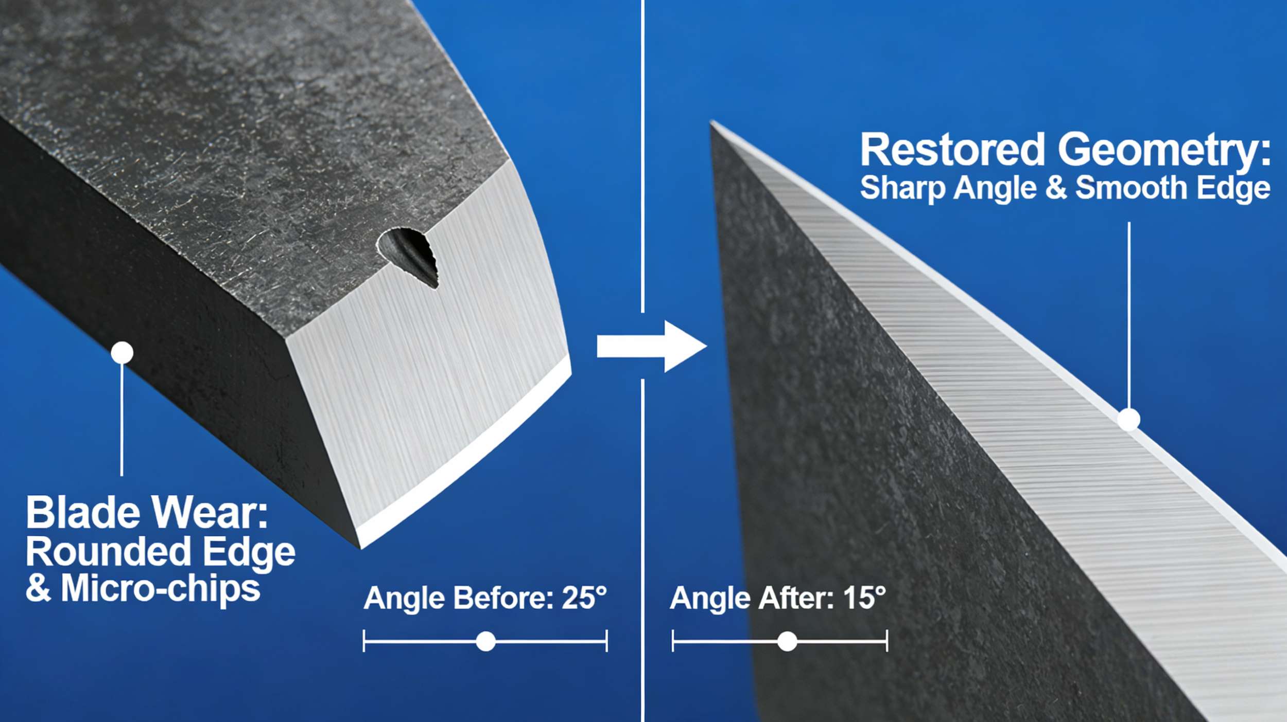 刃は使用を重ねるにつれて徐々に摩耗し、刃先が鈍くなり、切断力が増し、製品にバリが発生しやすくなり、エネルギー消費量も増加します。定期的に専門家による研磨を行うことで、切れ味を回復できるだけでなく、小さな歪みも矯正し、切断精度を確保することができます。